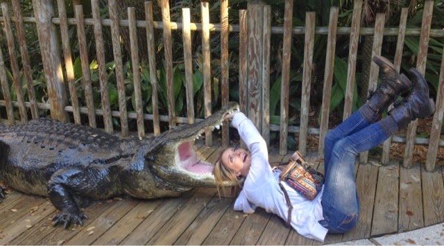 Day three, and our last day of the trip, we paid a visit to St. Augustine's Alligator Park! It was a wonderful experience. A little zoo primarily devoted to gators and their kin, it enthralled even the cantankerous Caveman in our group. He was amazed by the gorgeous alligator specimens, and intrigued by the terrific crocodile Maximo! We attended an animal show whose actors included a box turtle named Caroline, a hog-nosed snake named Harley, and a sweet brown old man rabbit named Jesse. The kids were allowed to love on old Jesse, and the Caveman is still remarking on his memory of "the Easter bunny on our trip". Auntie A paid a large fee and signed a release to be photographed inside of the alligator enclosure with her hand resting on the spine of a specimen named Skipper! We couldn't leave the park without a stop in the gift shop where my offspring each chose a stuffed alligator of their own to take home.